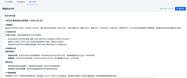 3. 深度报告:自动生成包含AI分析结论的综合数据报告(如图7),清晰呈现污染物趋势、异常事件剖析、气象关联性等,为管理复盘和长期规划提供强有力的数据支撑。